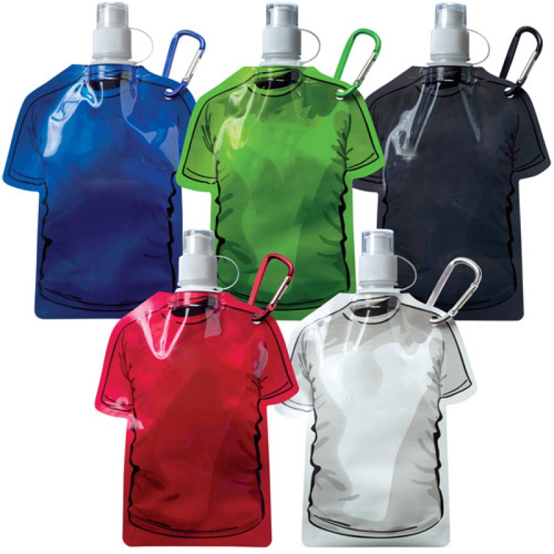 Medidas: Altura: 25.2 cm. Ancho: 16.6 cm. (Considerar de manga a manga) Capacidad: 500 ml. Material: Polietileno. Accesorio: Argolla, sujetador de metal del color de la camiseta.